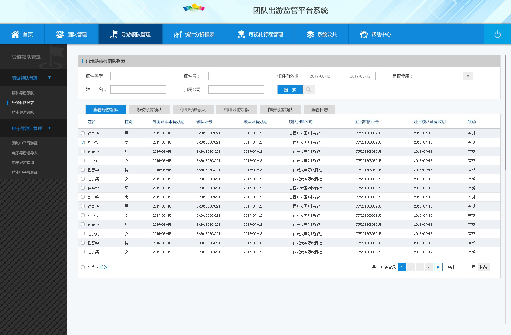 2) 導游/領隊管理:導游領隊管理、電子導游證管理。