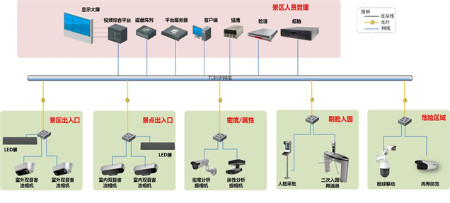 系統主要由雙目客流攝像機、LED顯示屏等組成,所有設備通過網絡方式進行連接,所有的數據及信號通過內部網絡上傳到監控中心進行存儲及管理。前端的崗亭分控中心可實時對各種設備做應急管理控制,以應對相關的緊急情況,后端平臺主要承接統計分析及應急指揮的工作。